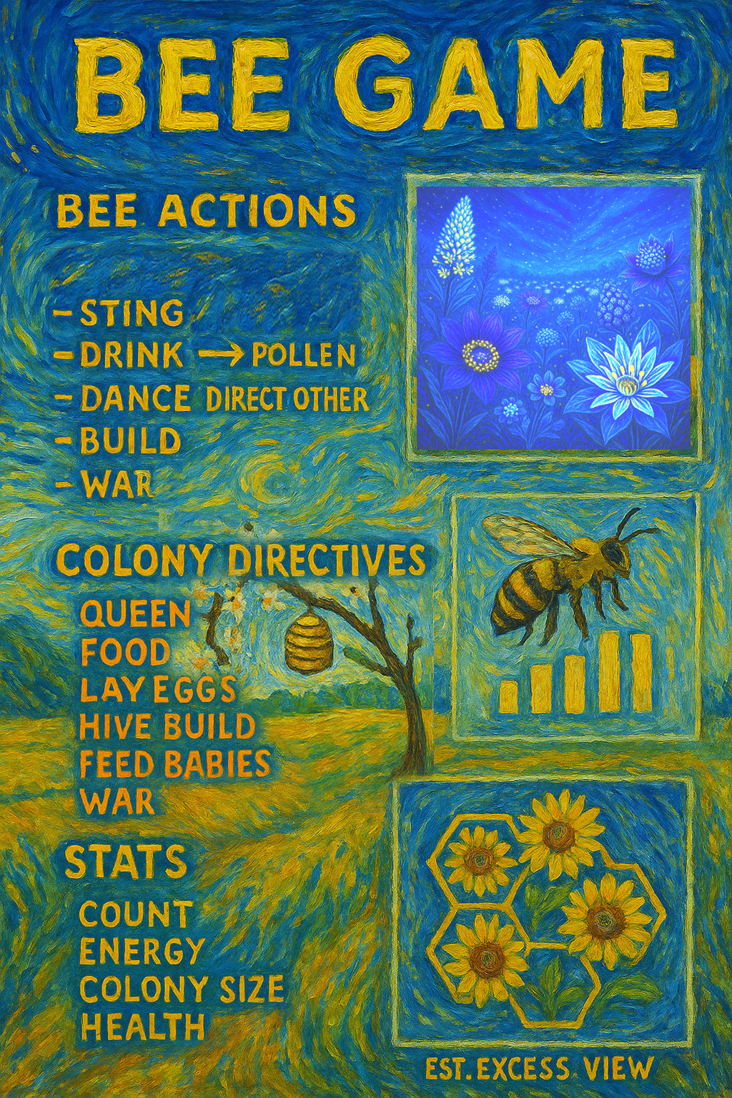 Bee Game A game about a bee colony exploring, planning, expanding, and strategizing.